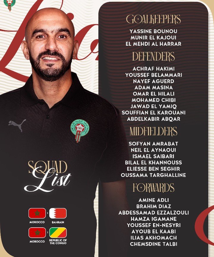 وسيواجه المنتخب الوطني المغربي منتخب البحرين، ثم منتخب الكونغو برسم التصفيات الإفريقية المؤهلة لنهائيات كأس العالم 2026، المقرر تنظيمها بشكل مشترك في الولايات المتحدة الأمريكية وكندا والمكسيك.