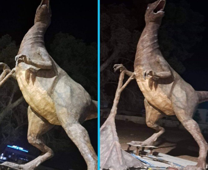 نعم … للدينصور علاقة بتكوينات جيولوجية أو اكتشافات أثرية شهدتها المنطقة،…لكن التمثال لا يُقدم أي تفسير ، ولا يُستغل في سياق سياحي أو تربوي، ولا يحمل أي بعد فني يُغري بالنظر أو التصوير. شكله لا يوحي بالجاذبية، بل يُثير الخوف والانزعاج.