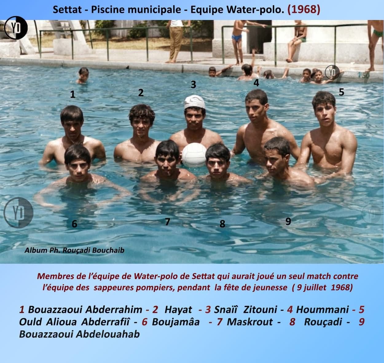 وفي الثانية، ماءٌ يحتضن أجسادًا فتية سنة 1968. فريق لكرة الماء، في مدينة لم تنتظر أن تُعرَّف بها الرياضة، بل ذهبت إليها. مشهد يبدو بسيطا، لكنه في الحقيقة بيان صامت: هنا، الرياضة ليست كرة تُركل فقط، بل أفق يُجرَّب. هنا، كانت كرة اليد، والسلة، والطائرة، والطاولة، وألعاب القوى… كلها تتقاسم الهواء ذاته، كما لو أن المدينة قررت أن تتنفس بكل رئاتها.
